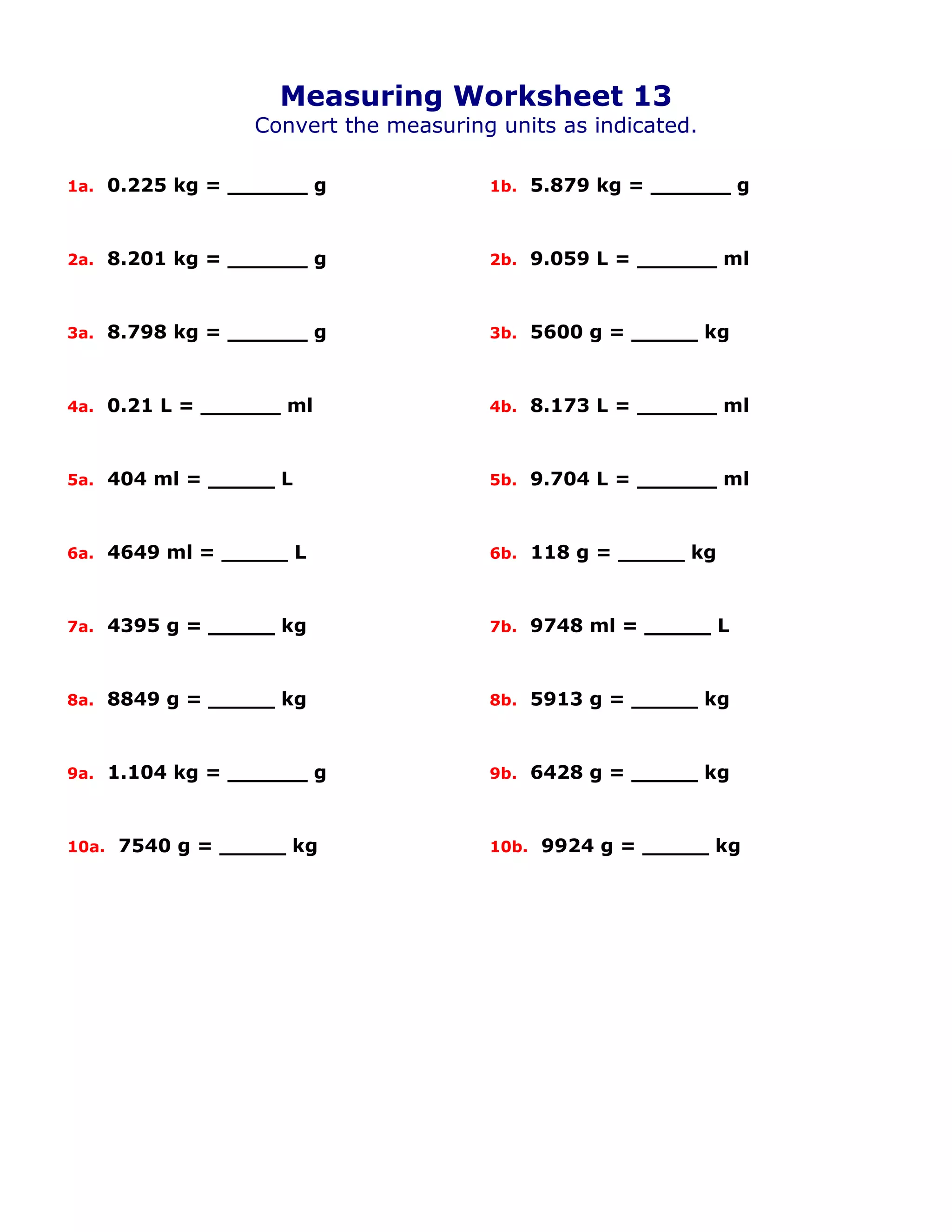 Free grade 6 measuring worksheets - Homeschool Math WebCreate an unlimited supply of worksheets for conversion of measurement units for grade 6, including both customary and metric units. The worksheets can be made in html or PDF format – both are easy to print. You can also customize them using the generator below. On this page, you can make grade 6 measurement units worksheets for: